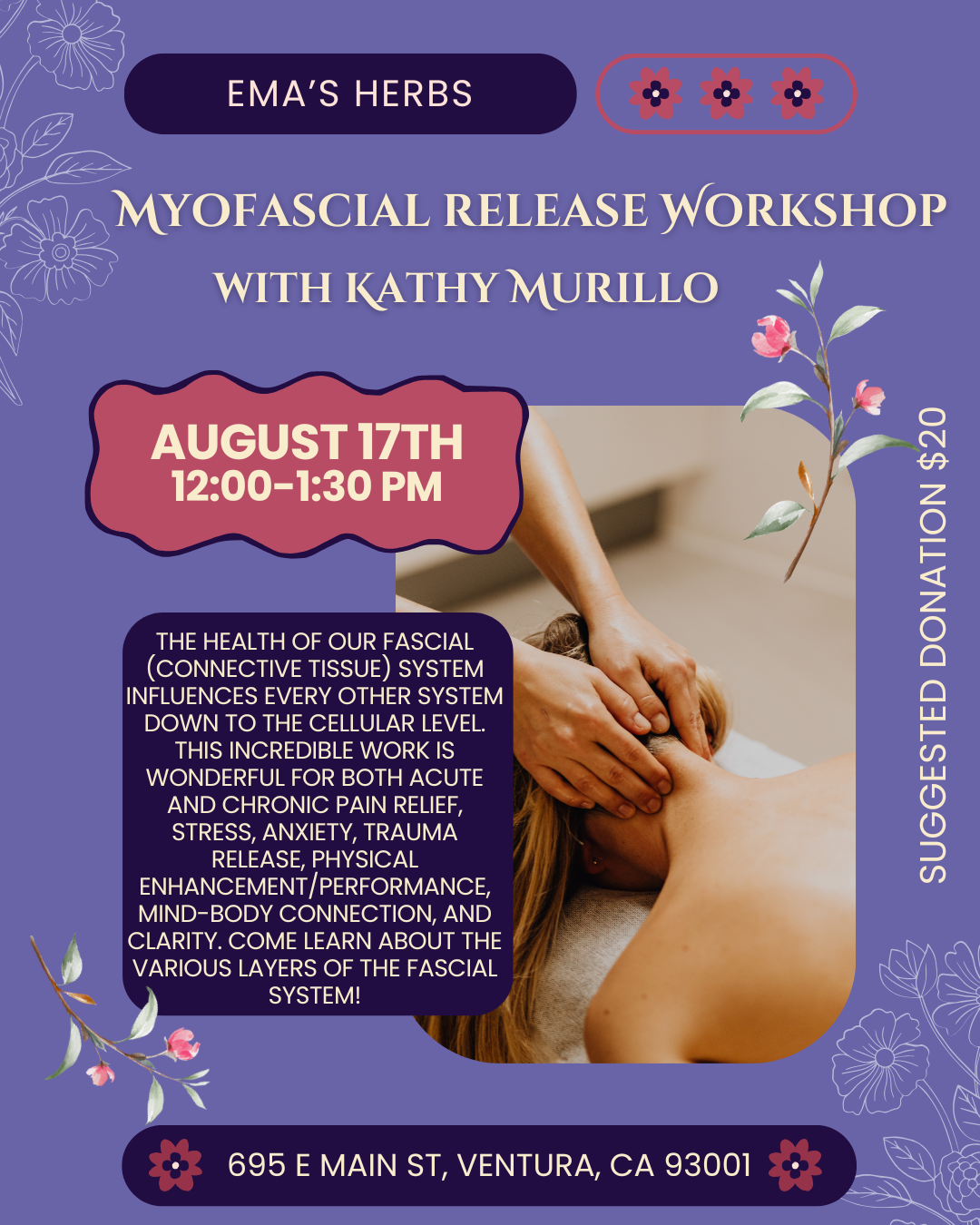 Join me for an integrative lecture on Myofascial Release 🙌🏼 At Emma’s Herbs on Main Street in Ventura Kathy MurilloJuly 31, 2025 Facebook0 Twitter 0 Likes